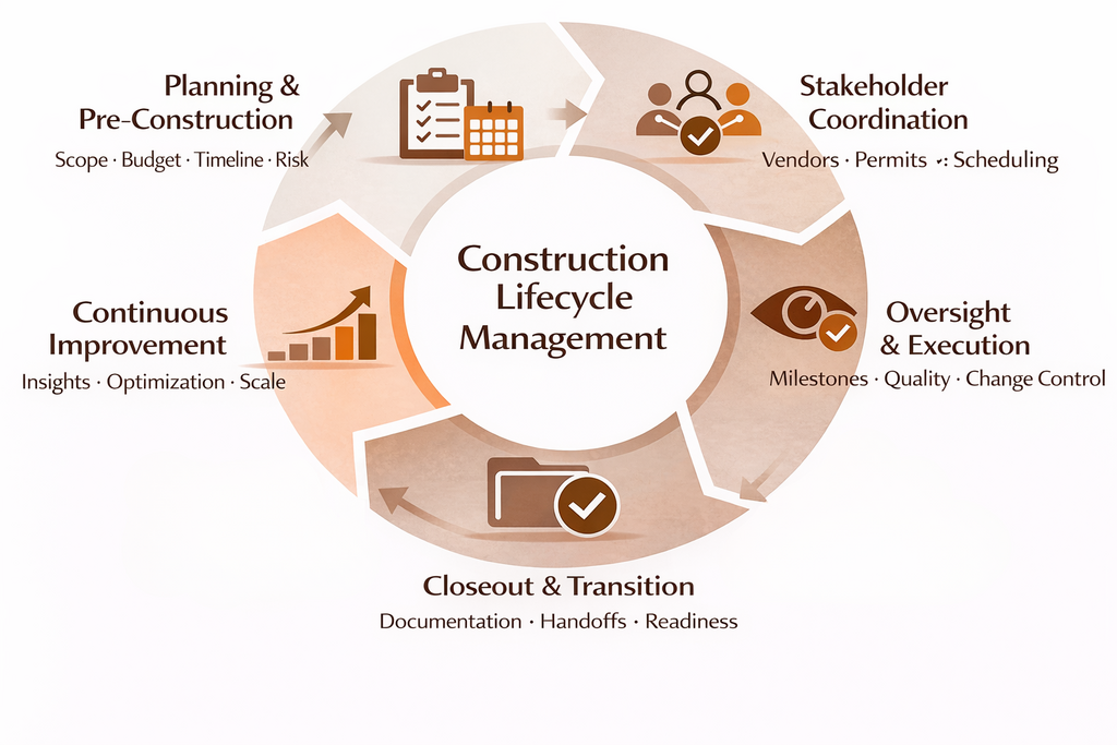 We act as your owner’s representative, aligning stakeholders, contractors, and timelines while protecting brand standards and financial controls.